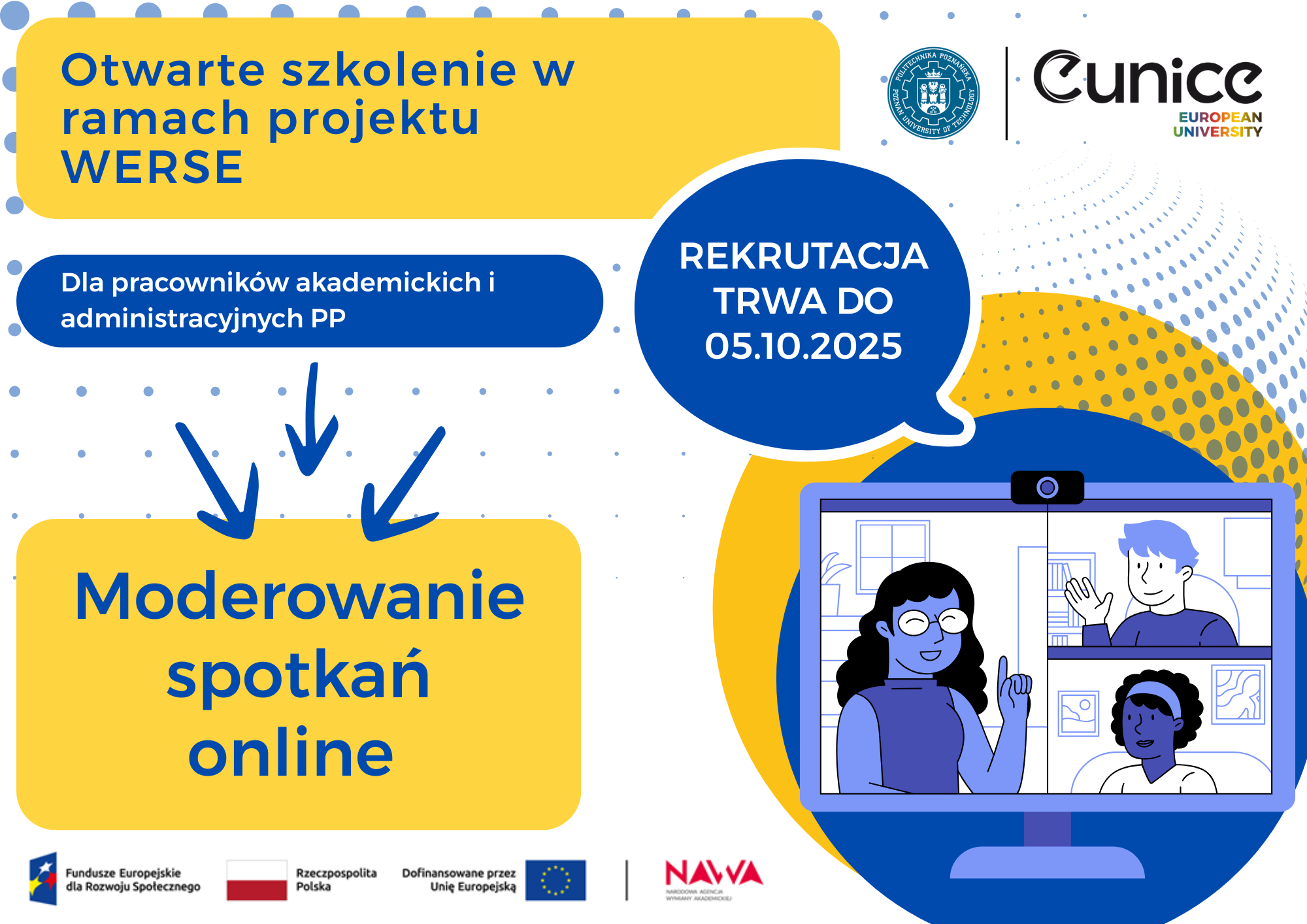 Dział ds. Uniwersytetu Europejskiego ogłasza nabór pracowników (zarówno administracyjnych jak i akademickich) Politechniki Poznańskiej na udział w szkoleniu „Moderowanie spotkań online” – liczba dostępnych miejsc: 20.