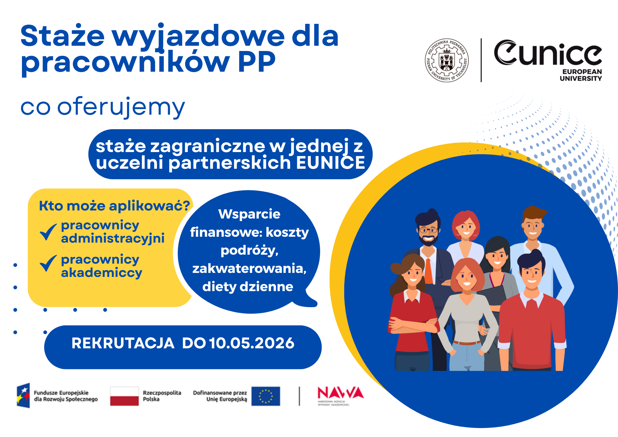 Mobilności skierowane są do pracowników Politechniki Poznańskiej i będą realizowane wyłącznie w uczelniach partnerskich zrzeszonych w sojuszu EUNICE. Program umożliwia zdobycie doświadczenia zawodowego w międzynarodowym środowisku, poznanie dobrych praktyk stosowanych na innych uczelniach oraz rozwój współpracy w ramach sojuszu